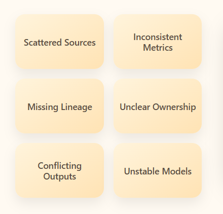 Across the industry, AI projects fail for predictable reasons. Teams focus on the model and overlook the data environment behind it. Without strong governance, clear definitions, and documented lineage, even advanced models cannot produce reliable results.